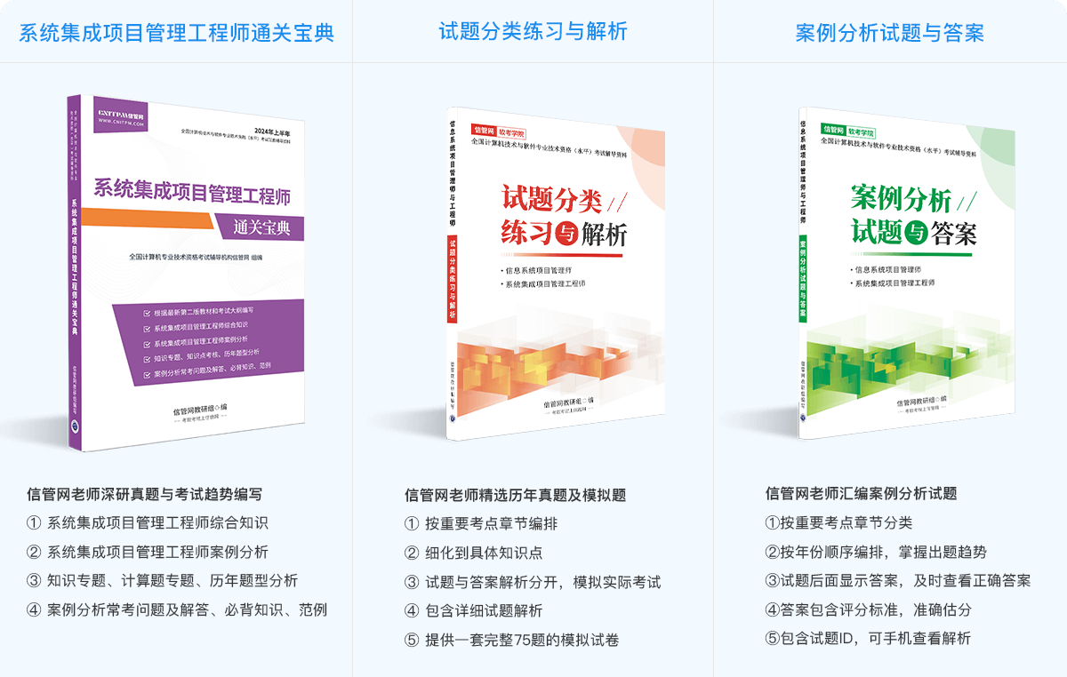 除了官方教材外,這里也推薦下信管網(wǎng)《系統(tǒng)集成項(xiàng)目管理工程師輔導(dǎo)資料》,該資料由信管網(wǎng)資深講師們結(jié)合官方教材、大綱及歷年出題情況和命題趨勢(shì)組織編寫,供培訓(xùn)學(xué)員內(nèi)部使用,不單獨(dú)出售。